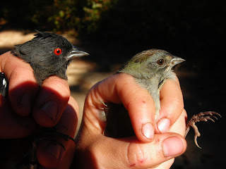 Spotted (adult) and Green-tailed (immature) Towhees; Aug 31, 2007. This is the 4th Green-tailed we've captured in 11 seasons - all since 2004. Note the difference in eye color.